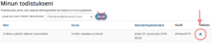 Kuvassa nuoli osoittaa painikkeen, josta todistus avautuu ladattavaksi:
